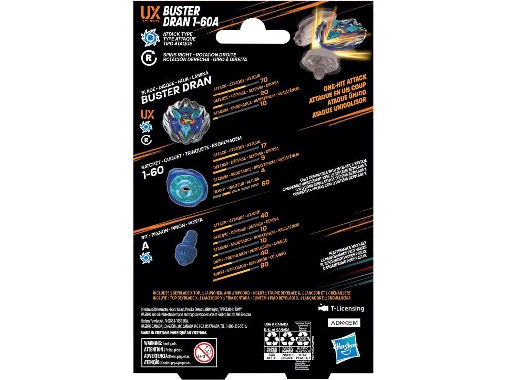 Když se soukolí topu Beyblade X zapojí do kolejnice arény Beystadium, může super-zrychlit do Xtreme Dash a raketově ho vystřelí po stadionu pro drtivé kolize a epické výbuchy. Bladeři pouštějí své vrcholy do divokých střetů proti soupeřovým bodům při každé konfrontaci – první, kdo získá 4 body, vyhrává. Hračky Hasbro Beyblade s autentickými kovovými díly Takara Tomy jsou skvělými dětskými dárky pro chlapce a dívky ve věku od 8 let.